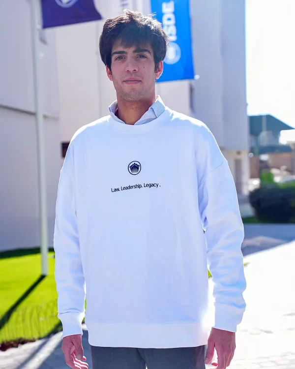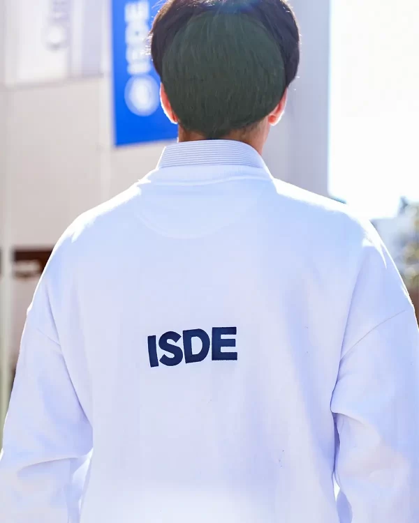 Combinación perfecta de minimalismo, calidad y sostenibilidad. Bordado exclusivo ISDE en hilo azul. Prenda esencial que representa compromiso con la moda responsable.